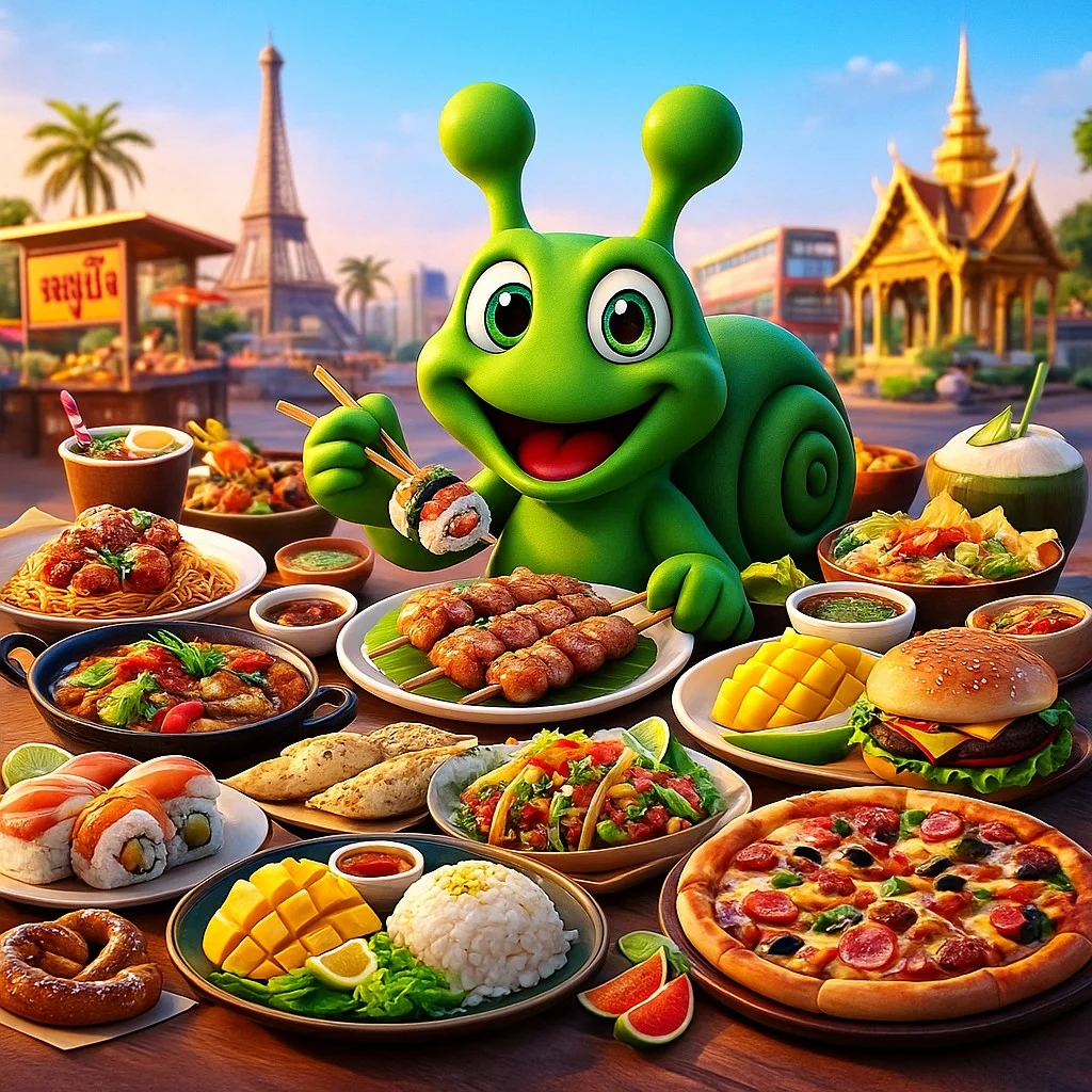 Slugsy Eats is Slugsy’s ongoing food adventure! From local street snacks to regional specialties and national favourites, Slugsy travels from place to place, trying new dishes and happily slugging his way through every flavour.